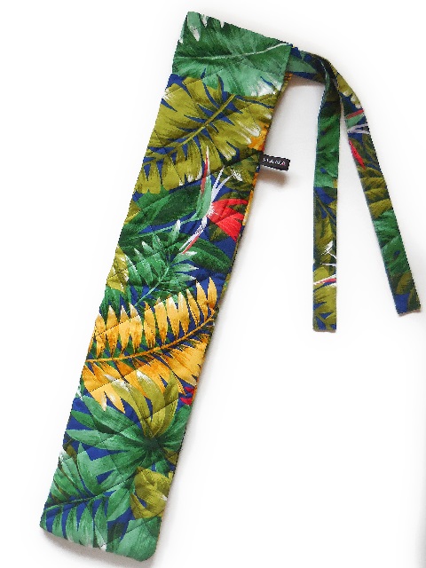 フラの楽器、大切なプイリを持ち運ぶケースです。やわらかいわたを表布と裏布の間にはさんで、一緒にキルティング加工した、プイリに優しい作りになっています。プイリがあたる裏側の縫い代は、プイリが傷つかないように、パイピング仕立てになっています。