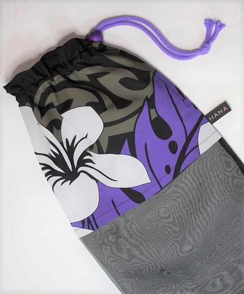 オ-ガンディ-使用の黒地に白いハイビスカスとパープルの葉模様のパウケ-ス、 オ-ガンディ-使用の黒地に白いハイビスカスとパープルの葉模様のパウケ-ス、
