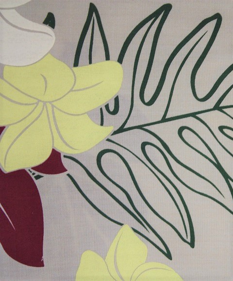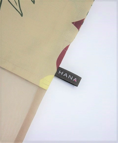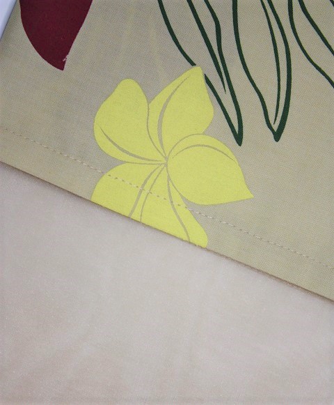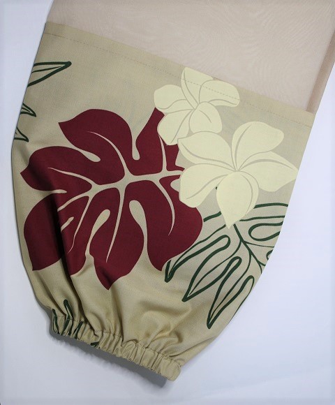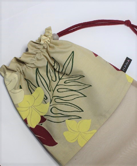 ベ-ジュ地に、白のプルメリアとえんじの葉模様。オ-ガンディ-使用のパウケ-ス
