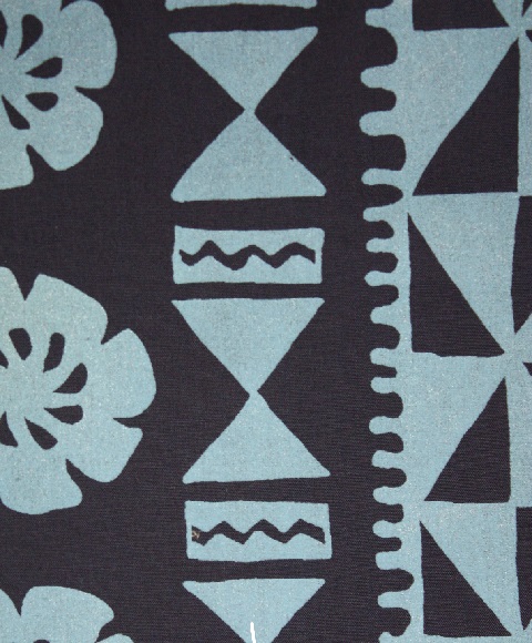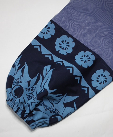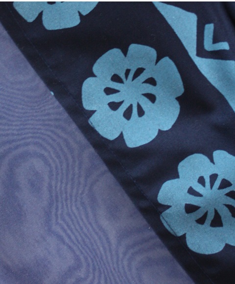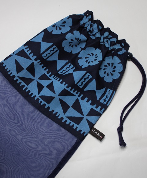 濃紺地にブル-の小花と葉のボーダ-柄カヒコ模様、オ-ガンディ-使用のパウケース 濃紺地にブル-の小花と葉のボーダ-柄カヒコ模様、オ-ガンディ-使用のパウケース